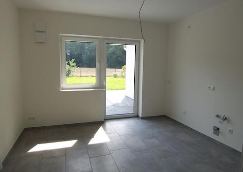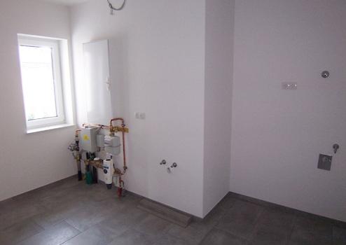 Die helle und freundliche Küche ist praktisch an den Hauswirtschaftsraum angeschlossen, in dem sich die Hauptanschlüsse für Gas, Wasser und Strom befinden. Von hier haben Sie direkten Zugang zur Garage – besonders praktisch für den Alltag. Auf Wunsch unterstützen wir Sie gerne bei der Auswahl einer passenden Einbauküche; unser Partner-Küchenstudio berät Sie professionell und individuell.