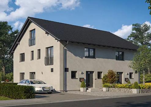 Das Grundstück ist mit einer ca. 112-140 m² großen Doppelhaushälfte von Haas Fertigbau beplant.