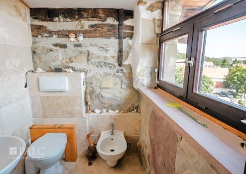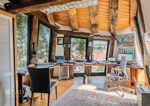 Ein Gäste-WC befindet sich ebenfalls im Erdgeschoss, was den Komfort für Besucher erhöht. Die Treppe führt Sie in das Untergeschoss, wo sich das Hauptschlafzimmer befindet. Es bietet Zugang zu einem Balkon, der einen wunderbaren Blick in den Garten und die Umgebung eröffnet. Ein weiteres Zimmer kann als Büro genutzt werden, ideal für Homeoffice oder kreative Projekte.