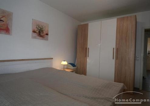Im Wohnzimmer gibt es einen Launch Bereich und einen großen Esstisch mit 4 Stühlen, von hier kommt man auch auf den großen Balkon. Das Schlafzimmer hat ein großes Doppelbett (1,80) und 2 große Schränke. Das Gäste/Arbeitszimmer verfügt über ein Schlafsofa und einem Schreibtisch. Die Enbauküche ist komplett mit Geschirr, Töpfen etc. ausgestattet