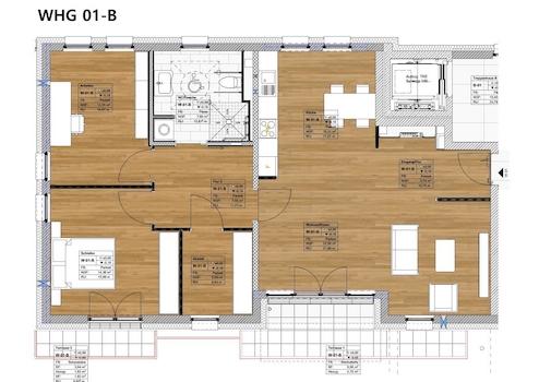 Die Wohnung besteht aus dem hellen Wohn/Essbereich von ca. 38 m² mit integrierter Küche. und Zugang auf die sonnige Terrasse von ca. 9 m². Auf Wunsch kann die Küche offen oder geschlossen gestaltet werden. An den Wohnbereich ist der separate Schlaftrakt angegliedert. Dieser besteht aus dem Elternschlafzimmer von ca. 15 m² mit Ausgang auf die zweite Terrasse von ca.4 dem Abstellraum/Büro/Ankleide von ca. 6 m², einem geräumigen Kinderzimmer/Büro von ca. 13 m² sowie dem behindertengerechten Duschbad mit Fenster von ca. 8 m². Die gesamte Wohnfläche beträgt ca. 102 m². Die Wohnung wurde barrierefrei konzipiert.