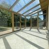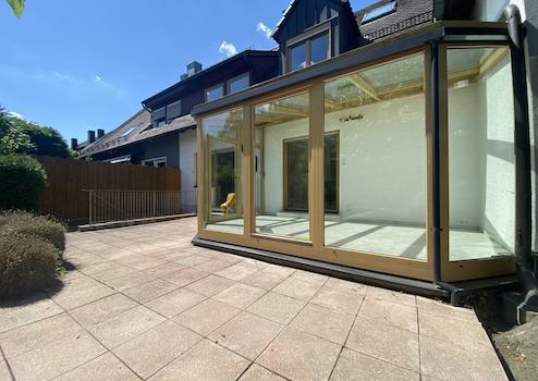 Die großen Fensterfronten lassen viel Tageslicht herein und bieten einen schönen Blick in den Garten.
