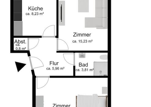 Diese großzügig geschnittene Wohnung befindet sich im 1. Obergeschoss rechts des Hauses. Den Bewohnern stehen zwei geräumige Zimmer, eine moderne Küche sowie ein Duschbad zur Verfügung. Zudem liegt der sonnige Balkon auf der Rückseite des Gebäudes. Ein Abstellraum befindet sich im Keller des Hauses, genauso wie ein Waschküche für die Bewohner.