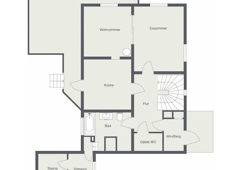 Erdgeschoss: Windfang, Flur, Gäste-WC, Bad, Vorraum, Sauna, Küche mit Zugang zur Terrasse, Esszimmer, Wohnzimmer