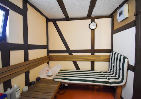 Eingangsbereich und Sauna, Schuppen, Terrasse = Holzvertäfelung, gestrichen