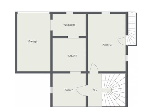 Kellergeschoss: Flur, 3 Kellerräume, Werkstatt, Garage