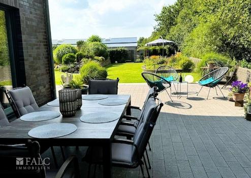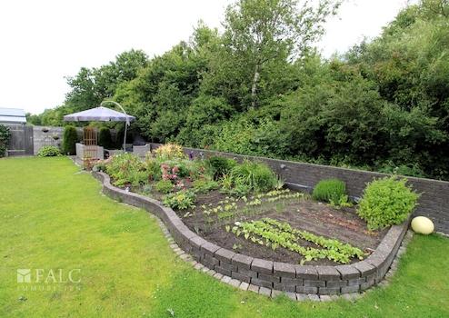 Doppelgarage mit Fußbodenheizung, gepflegter Garten mit Bewässerungssystem, Rasenmähroboter und Geräteschuppen.