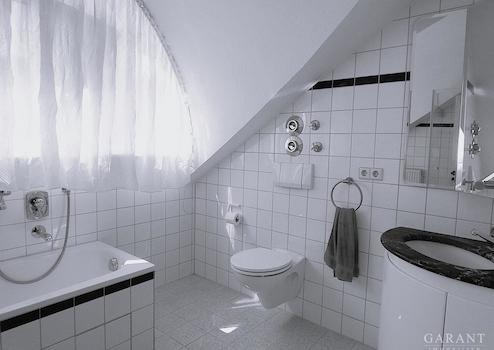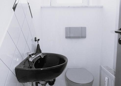 Zwei Schlafzimmer und das Tageslicht-Bad befinden sich in der oberen Etage, auf der Wohnetage gibt es ein Gäste-WC.