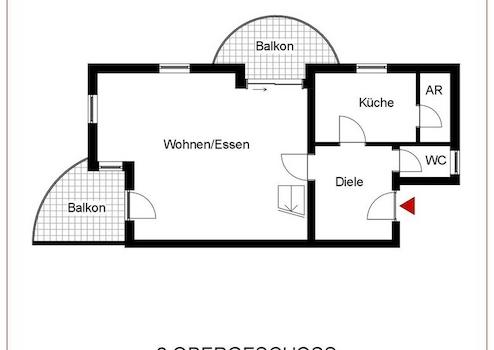 OG: Flur, Gäste-WC, Küche, Ess- und Wohnzimmer, zwei Balkone