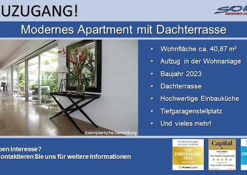 - Das Apartment verfügt über einen Wohn-/Essbereich mit einer modernen Einbauküche, sowie ein Badezimmer mit Dusche, Zugang auf die Dachterrasse, Waschbecken und Anschluss für die Waschmaschine