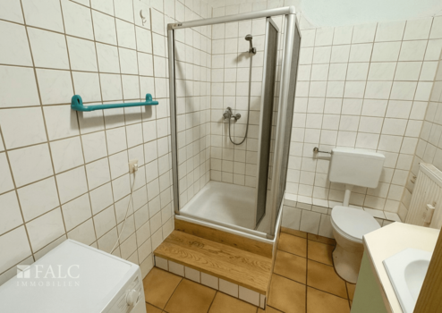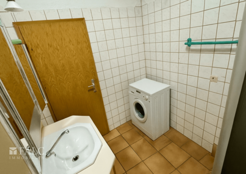 Das Badezimmer ist mit einer Dusche ausgestattet und bietet zudem Platz für eine Waschmaschine. Die gefliesten Wände und der praktische Schnitt machen es zu einem funktionalen Raum für den Alltag.