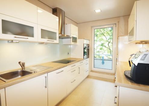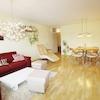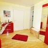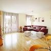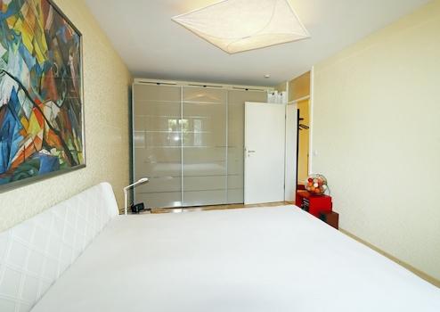 Rechter Hand liegt das großzügige Wohn-/Esszimmer mit angrenzendem Balkon, der mit seiner schönen Aussicht zum Entspannen einlädt. Gegenüber vom Wohn-/Esszimmer befinden sich die beiden Schlafräume und die Küche mit separatem kleinem Balkon.