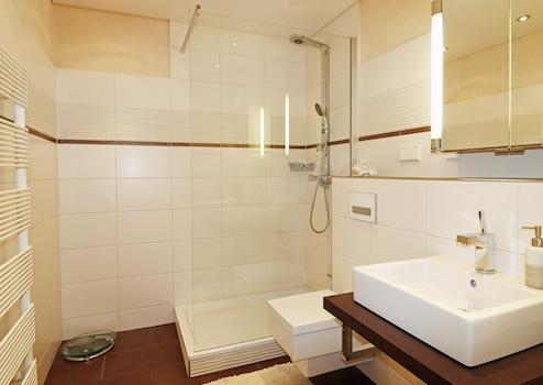 Die Küche mit der hochwertigen und modernen Einbauküche ist ein echter Blickfang, hier macht das Kochen Spaß. Das helle Bad mit Dusche, WC, Handwaschbecken und Waschmaschinenstellplatz und das separate Gäste-WC runden die Wohnetage ab.