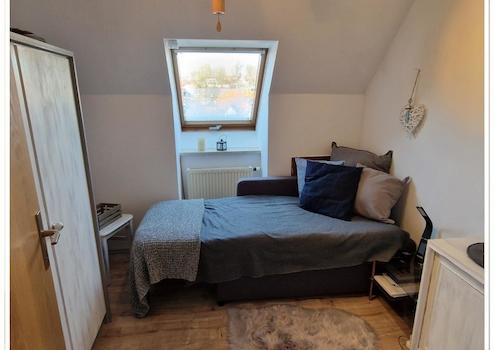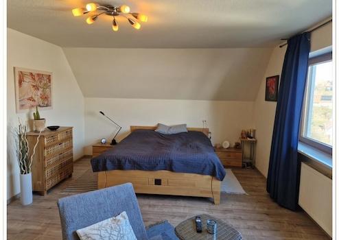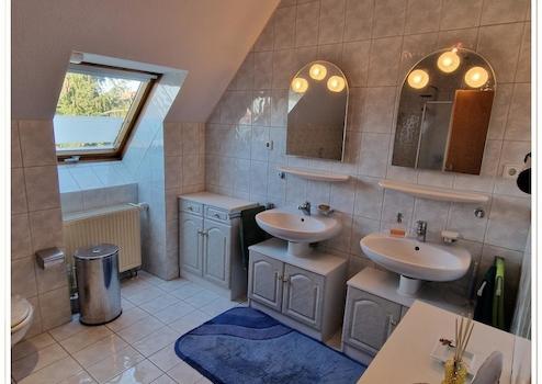 Im Dachgeschoss schließlich besticht das sehr geräumige Schlafzimmer (ca. 26 m²), das nach Osten hin ausgerichtet ist: ein Traum, denn der Blick geht übers unbebaute freie Feld, so dass Sie die Morgensonne genießen können, wann immer der Himmel entsprechend klar ist. Neben diesem großen Zimmer gibt es ein großes Tageslichtbad mit Wanne und Dusche sowie 2 Waschbecken, ein kleineres Zimmer und eine über
