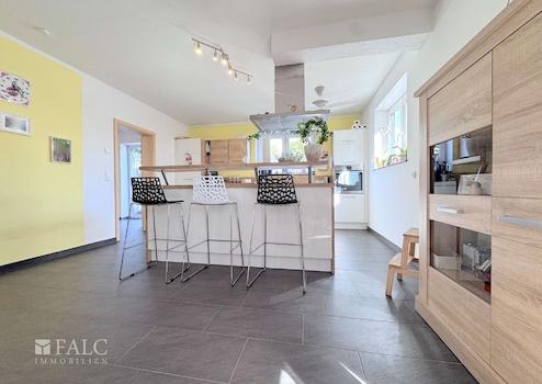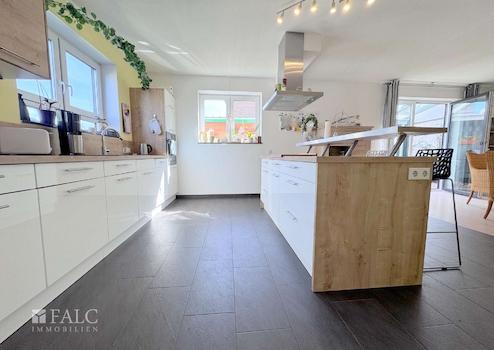 In den Wohn- und Schlafräumen ist pflegeleichter Laminatboden verlegt, der den Räumen eine warme und wohnliche Atmosphäre verleiht. Die Küche sowie die Bäder sind modern gefliest und dadurch besonders pflegeleicht. Die Einbauküche mit ihrer zentralen Kochinsel ist ein echter Blickfang und zugleich sehr funktional – hier findet die ganze Familie Platz zum gemeinsamen Kochen und Verweilen.