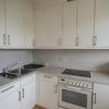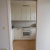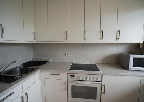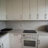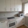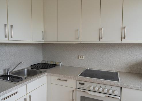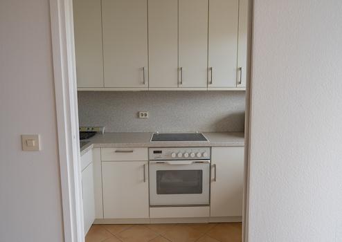 Die Einbauküche in der Farbe Weiß besteht aus Spüle mit Armatur, E-Herd mit Backofen und Ceran-Kochfeld, Unterbaukühlschrank und L-Förmige Arbeitsplatte. Diverse Unterbau- und Hängeschränke sind vorhanden.