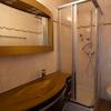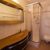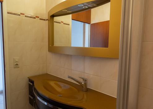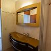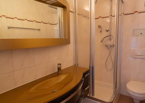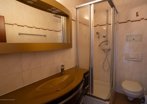 Das innenliegende Bad verfügt über helle, türhohe Wandfliesen mit einer umlaufenden Bordüre, passend zu den terracottafarbenen Bodenfliesen. Eine Duschkabine, eine Toilette, ein Waschtisch mit Einhebelmischbatterie sowie ein Spiegel mit Beleuchtung sind vorhanden.
