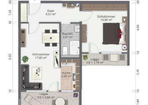 Lassen Sie sich verwöhnen von dem durchdachten Grundriss mit Diele, Wohnzimmer, Küche mit Fenster, Schlafzimmer und Badezimmer. Vom Wohnzimmer und vom Schlafzimmer erreichen Sie je eine Süd-Ost Loggia. Hier kann man seine Freizeit genießen sowie den Abstand vom Alltag und einen gemütlichen Feierabend erleben.