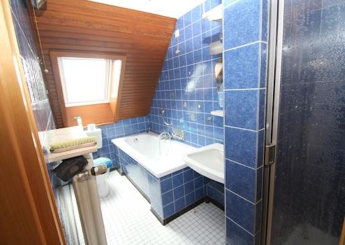 - Bad mit Badewanne, Dusche, Waschbecken, WC, Fenster, Gussheizkörper