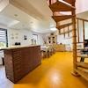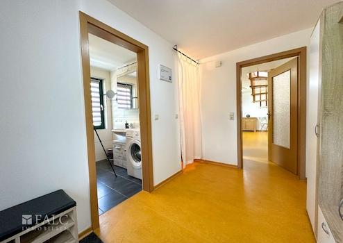 Das Wohnraum-Konzept der Hauptwohnung beinhaltet im Erdgeschoß einen Eingangsbereich mit Hauswirtschaftsraum, ein Wohnzimmer mit Kamin, ein Esszimmer, eine Küche, ausgestattet mit einer umfangreichen Einbauküche, ein Schlafzimmer, ein Kinderzimmer, ein Badezimmer und einen Hauswirtschaftsraum mit Zugang zur Garage, im Dachgeschoß befinden sich ein Arbeitszimmer, ein weiteres Schlafzimmer, ein Dusch-Bad und der Flurbereich.
