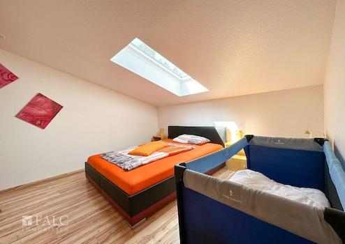 Die Raumaufteilung der Ferien-Wohnung umfasst im Erdgeschoß eine offen gestaltete Wohn-Küche, ausgestattet mit einer Einbauküche, ein Dusch-Bad und einen Flurbereich, im Dachgeschoß sind 2 Schlafzimmer, ein Wannen-Bad und ein Flurbereich vorhanden.