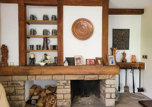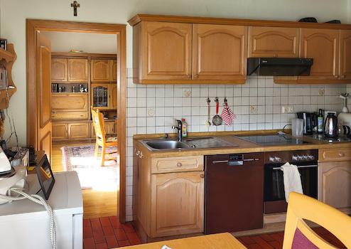 Im Erdgeschoss befinden sich die Küche, das große Wohn-/Esszimmer mit Kamin und Zugang zur überdachten Terrasse sowie ein Badezimmer.