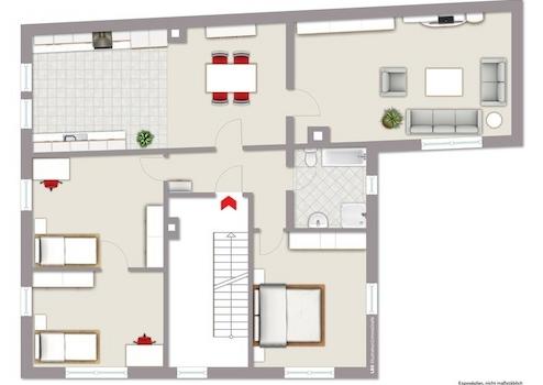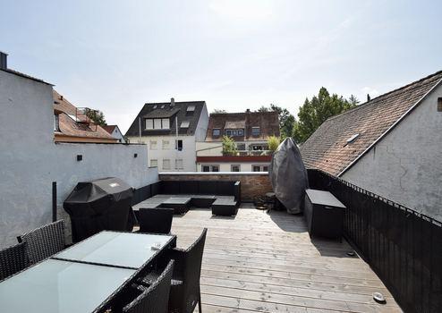 Das Ober- und Dachgeschoss verfügt über 7 Zimmer, Küche, 2 Badezimmer, 2 Dielen, sowie eine Dachterrasse.