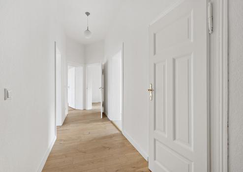 In der Freiimfelder Straße 19 in Halle (Saale) wartet eine komplett sanierte 3‑Zimmerwohnung mit ca. 90 m² Wohnfläche auf neue Mieter. Die Wohnung befindet sich im 1. Obergeschoss eines gepflegten Mehrfamilienhauses und besticht durch ihren großzügigen Grundriss. Ein besonders großer Flur führt zu allen Räumen und schafft eine offene, einladende Atmosphäre.