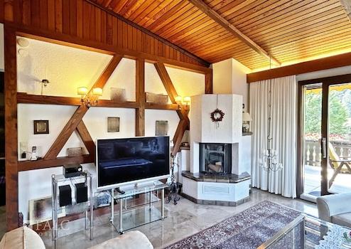 Das Erdgeschoss beherbergt ein geräumiges Wohnzimmer mit gemütlichem Kamin, das durch große Fensterfronten viel Tageslicht einlässt und einen direkten Zugang zum Balkon bietet. Der Balkon lädt dazu ein, die frische Luft und den Blick auf den gepflegten Garten zu genießen. Angrenzend befindet sich das Esszimmer, das ideal für gesellige Abende mit Familie und Freunden ist.