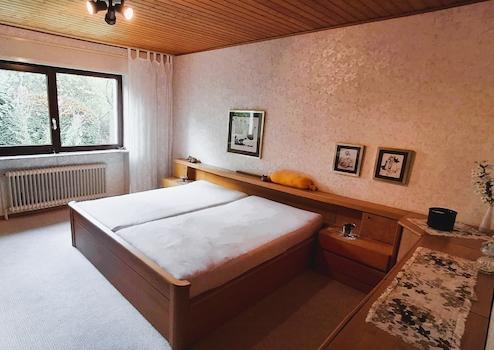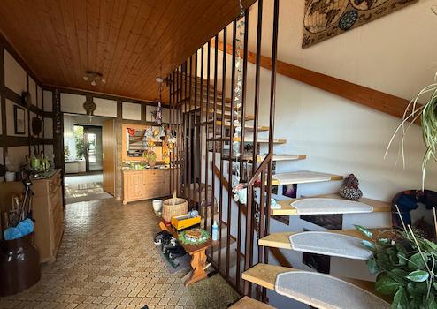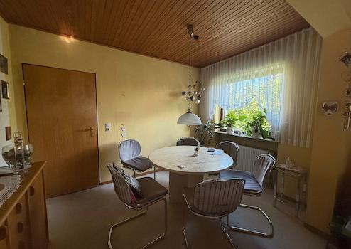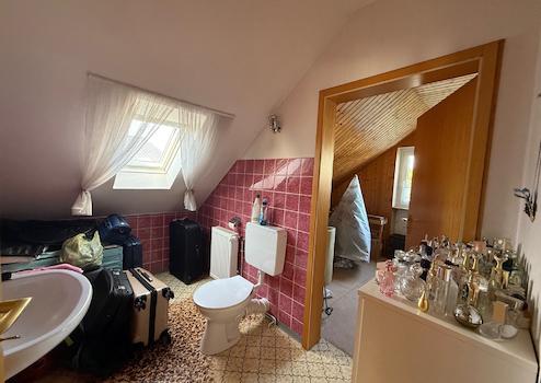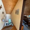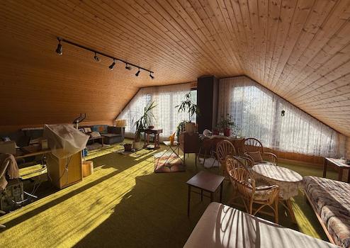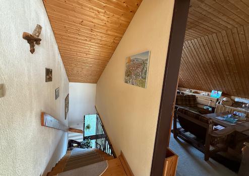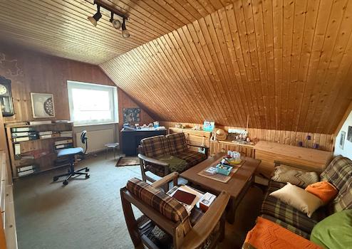 Im Dachgeschoss beeindruckt in erster Linie ein Studiozimmer mit einer Fensterfront über die gesamte Giebelseite. Hier hat man eine unverbaute Fernsicht Richtung Westen bis zum Elz und zum Elm, ein herrlicher Platz, um Sonnenuntergänge zu genießen und zu entspannen. Zudem finden hier zwei weitere Zimmer und ein WC Ihren Platz.