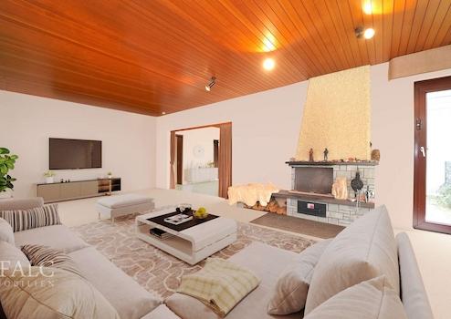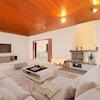 Der einladende Essbereich grenzt direkt an den Eingangsbereich und ist durch einen Durchgang mit Glaseinsatz abgetrennt. Diese lichtdurchflutete Trennung sorgt für eine freundliche Atmosphäre. Der Essbereich ist ebenfalls mit grünen Fliesen ausgestattet. Die große Fensterfront und eine Lichtkuppel lassen reichlich Tageslicht in den Raum strömen und schaffen die perfekten Voraussetzungen für gesellige Dinnerabende und familiäre Zusammenkünfte. Über die Fensterfront haben Sie direkten Zugang zur Terrasse mit Außenkamin, der eine gemütliche Atmosphäre erzeugt und die Terrasse zu einem idealen Ort für entspannte Abende im Freien macht. Das angrenzende Wohnzimmer, das ebenfalls Zugang zur Terrasse bietet, verfügt über einen Kamin, der an kühleren Tagen für wohlige Wärme sorgt. Große Fenster lassen auch hier viel Licht herein und der helle Teppichboden trägt zur gemütlichen Stimmung bei.