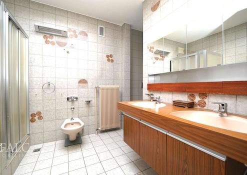 Auch das Familienbad ist über den Flur erreichbar und deckenhoch mit weißgrauen Fliesen ausgestattet. Eine Badewanne, eine Dusche, ein Bidet sowie der Doppelwaschtisch mit Unterschrank und einem beleuchteten Spiegelschrank komplettieren das Badezimmer. Auch hier sorgt eine Lichtkuppel für Tageslicht.
