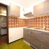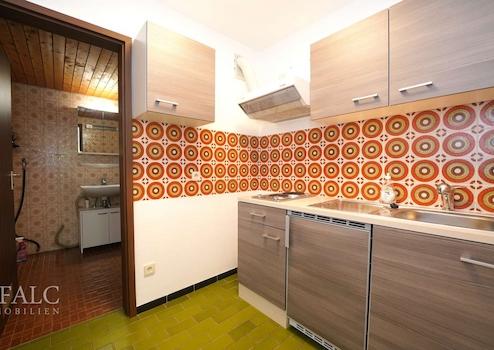 Die Küche ist im charmanten Vintage-Stil gestaltet und überrascht mit einem Boden aus grünen Fliesen, der einen nostalgischen Akzent setzt. Die Wände erstrahlen in typischen Vintage-Fliesen und verleihen der Küche ihren ganz eigenen Charakter. Angrenzend befindet sich das Duschbad, das mit rotbraunen Bodenfliesen und beigefarbenen Wandfliesen ausgestattet ist. Ein praktischer Unterschrank sowie ein Spiegelschrank bieten ausreichend Stauraum für Kosmetika und Stylingprodukte, sodass alles ordentlich und griffbereit bleibt.