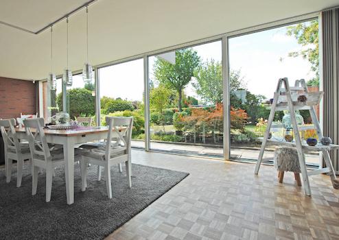 Wir bieten hier ein Einfamilienhaus in ruhiger Lage mit wunderschönem Garten an, entworfen vom Architekten Richard Neutra. Diese top-sanierte Immobilie befindet sich in einem verkehrsberuhigten und idyllischen Wohngebiet. Sie wurde 1964 in massiver Bauweise architektonisch anspruchsvoll errichtet und überzeugt durch einen durchdachten und großzügigen Schnitt sowie minimalistischer Eleganz. Neutra plante Flachdach-Bungalows mehrheitlich mit nur einem, wenige mit zwei Geschossen. Durch ihre deckenhohe, großzügige Verglasung ist eine unmittelbare Eingliederung in die Natur gegeben. Der Wohnbereich (ca. 42m²) empfängt mit einem wunderbaren Blick auf die sonnenverwöhnte Terrasse und in den Garten. Im Erdgeschoss (ca. 84m²) liegen benachbart die Küche, ein Arbeitszimmer und im Eingangsbereich ein Gäste-WC. Über eine Treppe wird das Obergeschoss (ca. 78m²) mit vier Zimmern und zwei Bädern (Vollbad und Duschbad) erreicht. Die zwei hinteren Räume sind derzeit partiell durch eine Wandöffnung verbunden und in einen Schlaf- und einen Arbeitsbereich aufgeteilt. Der Keller beherbergt die Hauswirtschaft, Vorräte, einen Heizungskeller sowie eine geräumige Werkstatt. Die gemauerte Garage liegt benachbart zum Grundstück; die Auffahrt bietet weitere Stellplätze. Von 2012 bis 2014 wurde das Einfamilienhaus äußerst aufwändig und in Abstimmung mit dem Denkmalschutz saniert: Sämtliche Fenster und Außentüren; eine neue Gasheizung mit Brennwerttherme speist die Umluftheizung; Solarthermie; ein wasserführender Kaminofen; Erneuerung der gesamten Elektrik; Erneuerung und Dämmung des Daches; Innendämmung sämtlicher Außenwände, Außendämmung des Kellers; Sanierung und Hydrophobierung der Ziegel; Erneuerung der Wasserleitungen; Modernisierung der Küche, der Bäder und des Gäste-WCs. Erneuerung aller Bodenbeläge: Eichenparkett und Fliesen im EG sowie Korkparkett im OG. Außenanlagen: Gartengestaltung und Pflasterung von Terrasse und Zuwegungen. Der Innenausbau ist stilgerecht umgesetzt worden, so dass die Elemente dem Original entsprechen. Aufbereitet wurden die Türen und Türgriffe, Türrahmen sowie die Treppen.