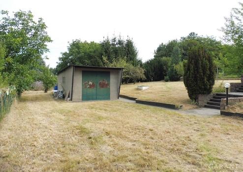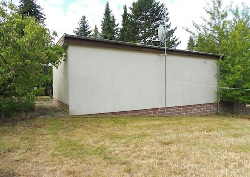 Das knapp 2.000 qm große Grundstück ist mit einem massiven Bungalow mit ca. 34 qm Wohn- und Nutzfläche bebaut, welcher Wohn- und Schlafzimmer, eine kleine Küche, das WC mit Dusche und Waschbecken und den Keller beherbergt. Eine Garage steht im nordwestlichen Teil des Anwesens.