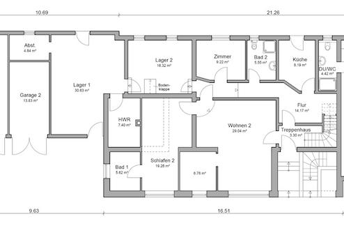 Zum Gebäude gehören auch die auf der Rückseite anliegenden Garagen und Lager mit einer Gesamtnutzfläche von 167,96m². Hier ist möglicherweise auch über eine Umnutzung nachzudenken, entsprechende Informationen erteilt Ihnen das Bauamt des Landkreises Harburg in Winsen. Interessant ist die Kombination aus Neubau und Altbestand. Hier sind mehrere Nutzungen möglich - ob Sie im hinteren Grundstücksbereich bauen und erst einmal den Bestand vermieten, den Bestand sanieren und ausbauen oder andere Möglichkeiten ausnutzen möchten. Wir beraten Sie gerne entsprechend.