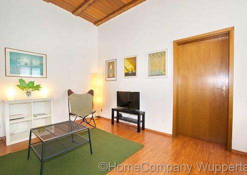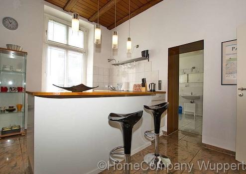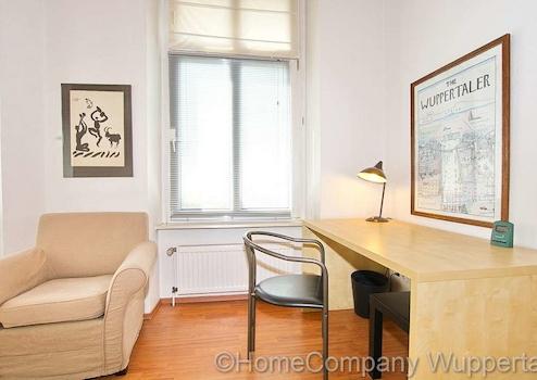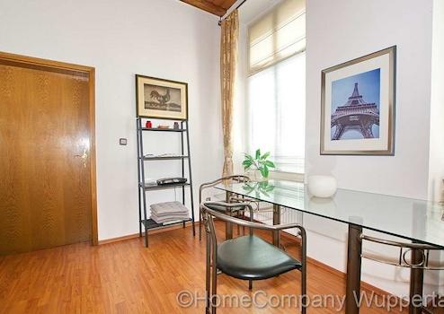 This apartment is located in the first floor of a multi-family house close to the Robert-Daum-Platz. Shopping opportunities can be reached in just five minutes on foot. The sky-train station and the bust stop are very close as well. The center of this very beautiful old apartment is the appealing eat-in kitchen including a kitchenette with an integrated bar counter. Furthermore, the kitchen offers the tenant a combined refrigerator-freezer, a ceramic cooktop including an oven, a microwave and a coffee-machine. The living room consists of a double sofa bed, a TV and a dining table seating four people. The spacious bedroom offers the tenant a 1, 60 m bed, a closet and a desk for home-office use. A huge bathroom including a bath tub, a separate shower a washing machine for sole use rounds of this beautiful city apartment. The rooms are laid out with laminate except for the bathroom and the kitchen area, they are laid out with granite floor. This is a non-smoking property. All monthly costs of utility and energy expenses for one person and the usage of the internet are included in the rent of € 1070, 00. The landlord is responsible for the cleaning after your stay. This will be invoiced according to the work involved at a rate of € 35, 00 per hour.