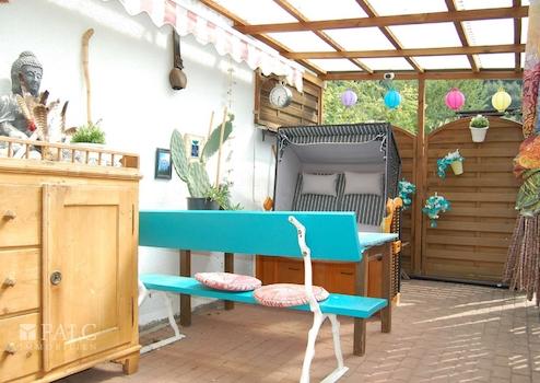 Eine grüne Oase darf bei einer Immobilie natürlich nicht fehlen. In Ihrem zukünftigen Garten, in dem sich ein Schuppen befindet, können Sie aufatmen und eine Pause vom Alltag einlegen. Erzeugen Sie hier Ihren ganz persönlichen Wohlfühlfaktor. Außerdem können Sie sich an einem gepflasterten und überdachten Freisitz erfreuen. Dort lassen sich auch an regnerischen Tagen schöne Stunden im Freien verbringen. Optimalen Sonnenschutz erhalten Sie durch eine unter dem Dach verbaute Markise.