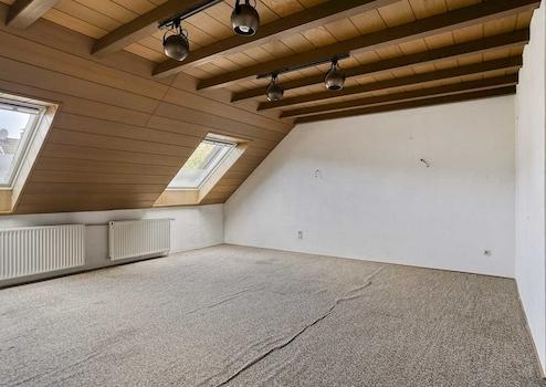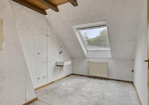 Wände/Decken: Wandflächen größtenteils mit Raufaser tapeziert und weiß gestrichen, mit Holz verkleidete Wand- und Deckenflächen im Dachgeschoss
