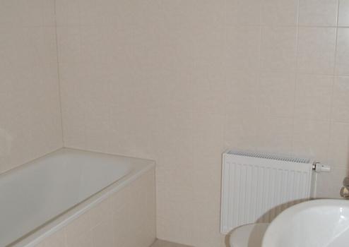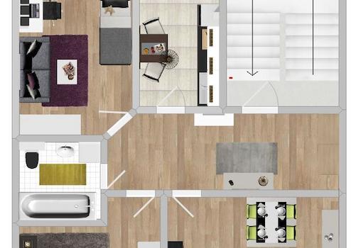 Das innen liegende Badezimmer mit Badewanne ist funktional gestaltet und komplettiert den Wohnkomfort.