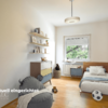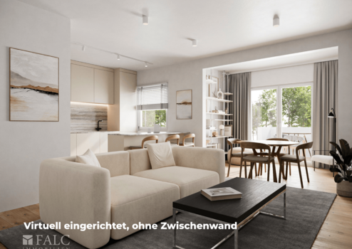 Im Erdgeschoss erwarten Sie eine separate Küche sowie ein einladender Wohnbereich mit direktem Zugang zum Balkon. Beide Räume sind aktuell voneinander getrennt, bieten jedoch die Möglichkeit, durch Öffnung der Wand eine großzügige Wohnküche zu schaffen (siehe Visualisierung). Zusätzlich befindet sich hier ein Gäste-WC mit Tageslicht.