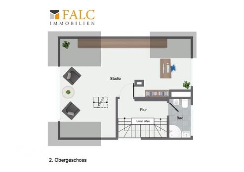 Im Obergeschoss stehen drei gut geschnittene Zimmer und ein Badezimmer mit Dusche und Badewanne zur Verfügung. Im darüber liegenden Dachgeschoss wartet ein toller weiträumiger Studio-Raum sowie ein weiteres kleines Duschbad auf eine neue Nutzung.