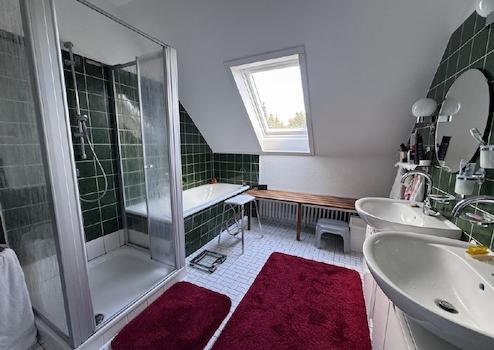 Das Badezimmer im Obergeschoss ist mit zwei Waschbecken, einer Badewanne, einer Dusche sowie Wand- und Bodenfliesen ausgestattet. Im Wohnbereich sind Holzfenster mit Isolierverglasung sowie Dachfenster vorhanden. Im Kellerbereich wurden Kunststofffenster mit Wärmeschutzverglasung eingebaut. Die Garage ist mit einem komfortablen Sektionaltor mit elektrischem Antrieb ausgestattet, einfaches Befahren ist garantiert.