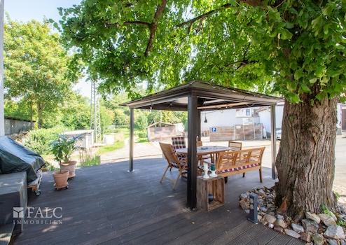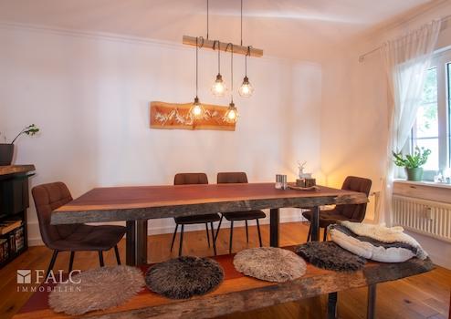 Eine Küche, ein Wirtschaftsraum mit Gäste WC gehören zum Raumprogramm dieser Etage. Das Highlight ist das ca. 37 m² große Wohn- und Esszimmer mit einer offenen Fachwerkwand als Raumteiler und einem Kamin. Dieser sorgt in kühlerer Jahreszeit für die behagliche Wärme und lädt Sie und Ihre Gäste zum Verweilen ein. Die vielen Fenster sorgen für einen hellen und sonnendurchfluteten Wohnbereich. Über einen Terrassenausgang gelangen Sie auf die vorgelagerte Südost Terrasse. Hier befindet sich auch eine große alte Linde, die besonders im Sommer für den nötigen Schatten sorgt.