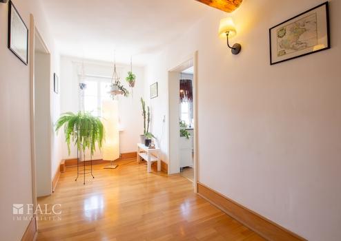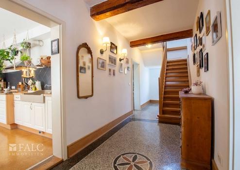 Über eine kleine Eingangstreppe betreten Sie das Haus und gehen durch eine historische Eingangstür. Hier werden Sie in der geräumigen mit einem Terrazzoboden ausgestatteten Diele empfangen. Von hier aus gelangen Sie zu allen Räumen des Erdgeschosses.