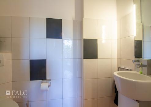 Das Gäste WC ist ebenfalls modernisiert und wurde halbhoch mit hellen Fliesen gefliest.