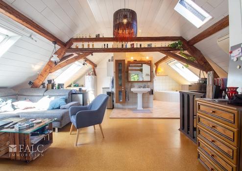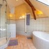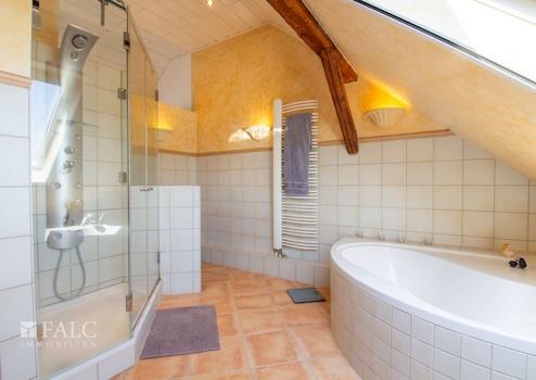 Das offene Badezimmer im Dachgeschoss ist modernisiert und mit hellen Fliesen halbhoch gefliest. Es verfügt über eine Dusche, eine Badewanne, ein Waschbecken und eine Toilette.