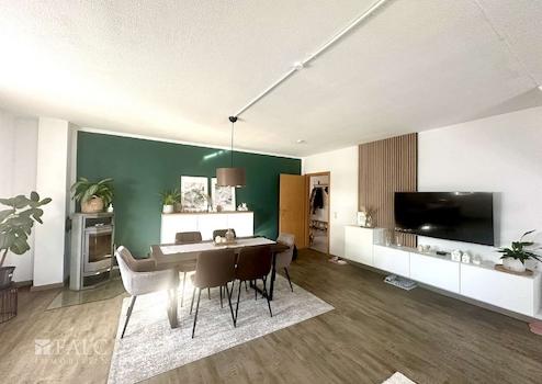 Als Herzstück der Wohnung fungiert hier das große Wohn- und Esszimmer mit Kamin und Zugang zum sonnigen Balkon. Der Ofen sorgt insbesondere im Winter für gemütliche Abende.