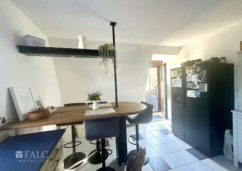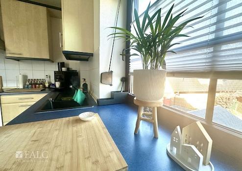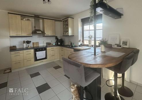 Die geschmackvolle Küche verfügt über eine Einbauküche und einen Tresen zum gemeinsamen Sitzen und Essen. Hier nimmt man seine Mahlzeiten gerne ein. Die Küche verfügt über ein bodentiefes Fenster. Den Balkon können Sie direkt von der Küche erreichen.