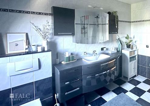 Ein Bad mit Badewanne, Dusche und stilvollen Schränken sowie ein kleines Gäste-Bad mit Waschmaschinen- und Trockneranschluss runden das Angebot im Obergeschoss ab.
